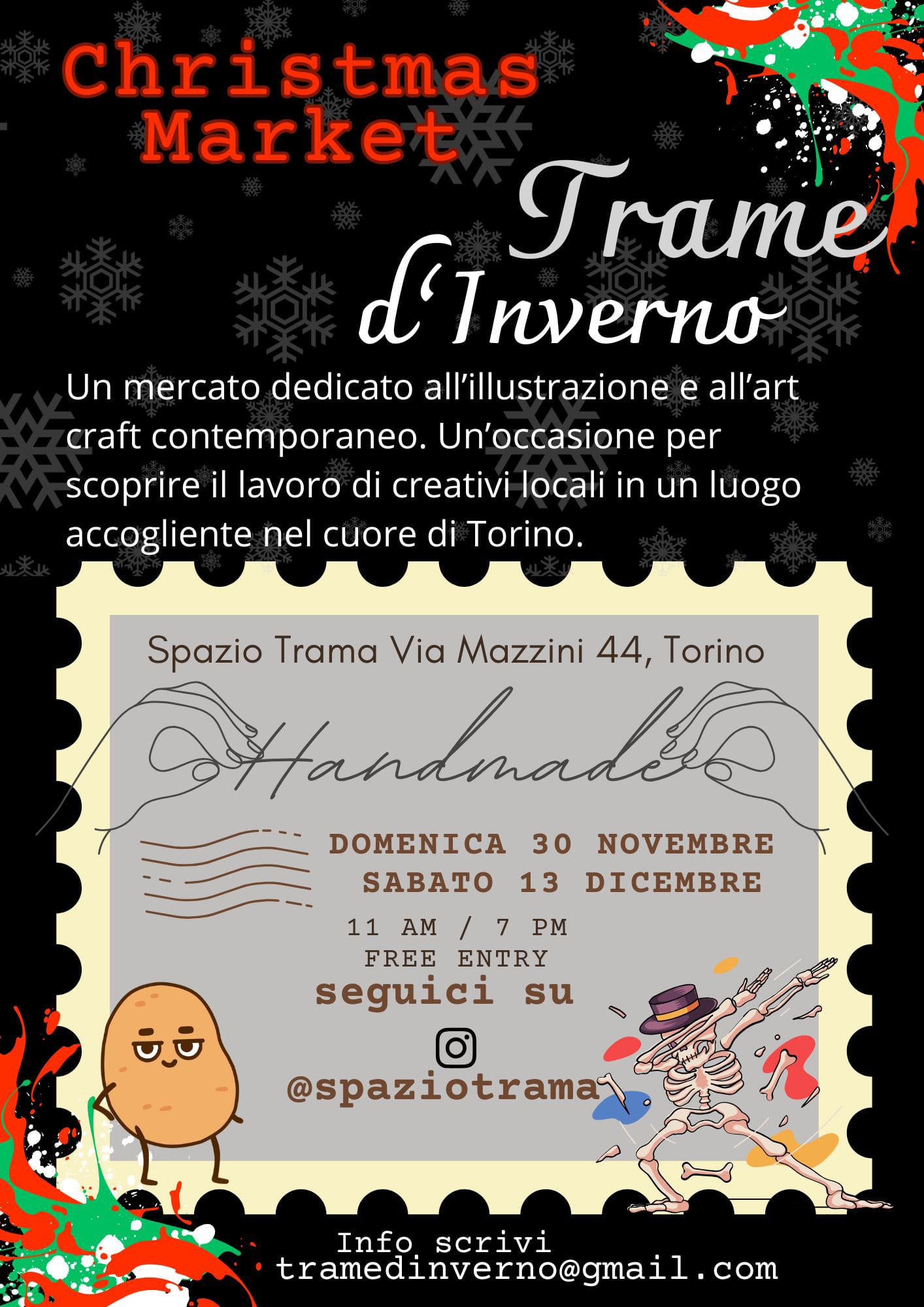 Michele ieri ha proposto perché a Trama non facciamo un mercatino di natale così che illustratorə artigianə creativə torinesi e non solo possano vendere le loro opere ed io gli ho risposto che è una bella idea e lui ha preparato una locandina che però a me non piace e così mi sono messo a pensare ma sai quelle giornate che non ti viene nessuna idea e poi non è facile perché Trama ha una ben precisa connotazione e da un lato bisognerebbe trovare qualcosa di accattivante da postare online e sai tutte le robe legate all’algoritmo di visibilità viralità e dall’altro restare fedeli alla linea che ovviamente è anticonsumista anticapitalista e poi insomma davvero ma che il natale, qua siamo tuttə diversə dall’ateismo al tecnopaganesimo all’animismo al pastafarianesimo e via dicendo e allora boh ci è venuto in mente di dirla così come viene ovvero: vogliamo sostenere la creatività alternativa e parimenti offrire alle persone l’occasione di incontrarsi, parlarascoltare, e magari acquistarescambiare cose da regalare in questo momento che inizia a fare freddo le lucine festive lampeggiano anche nei giorni feriali e insomma è inevitabile riflettersi nelle vetrine e riflettere sul significato del dono nel contemporaneo e quindi:
