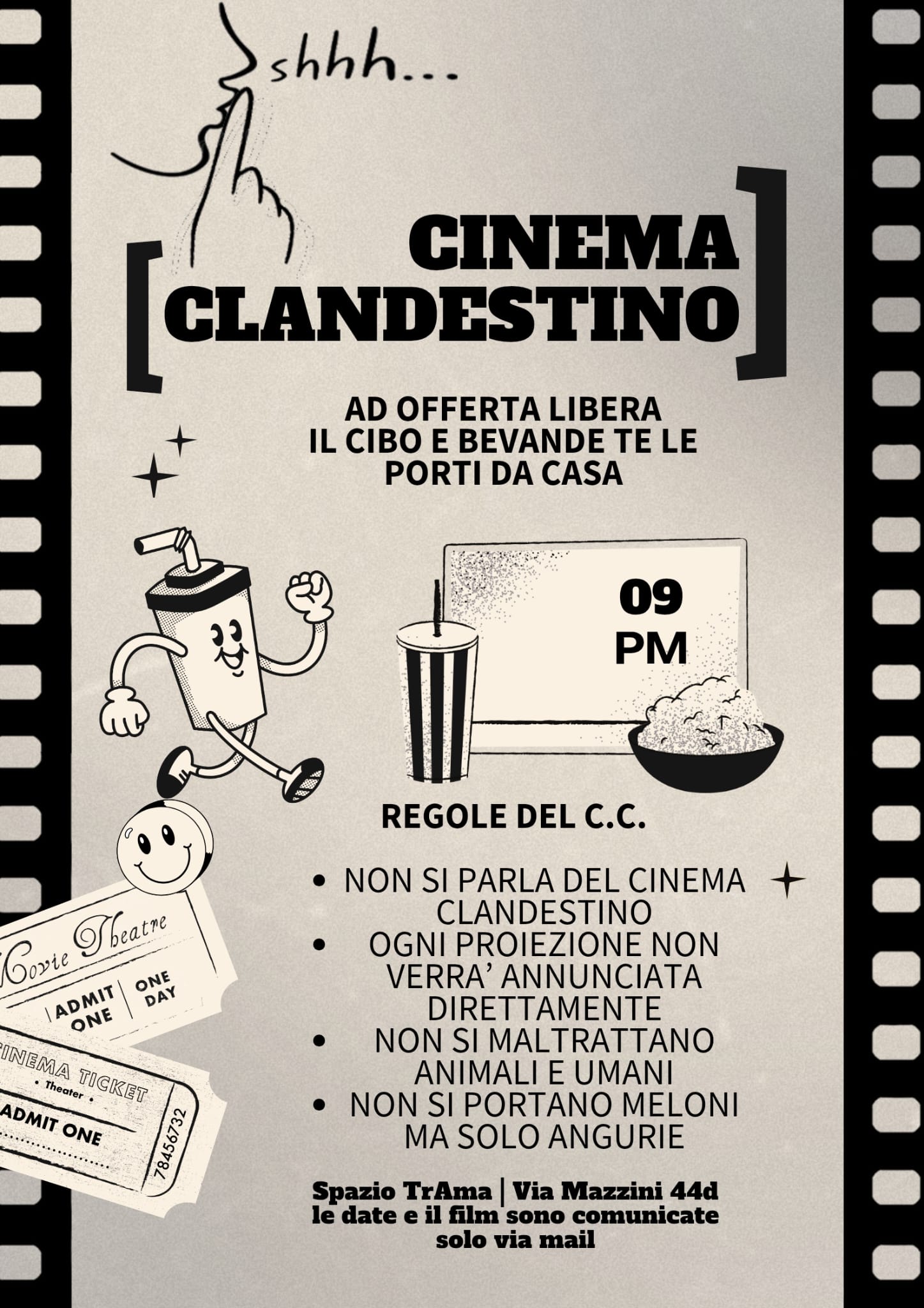 Cinema Clandestino è per chi: ama il cinema come esperienza, non come consumo è curioso, ma non ha bisogno di sapere tutto subito, crede nel valore della presenza fisica, apprezza i formati non dichiarati, non urlati. Non serve essere espert*… Serve solo disponibilità all’ascolto e allo sguardo. Serve venire e lasciarsi andare in compagnia in un ambiente famigliare!