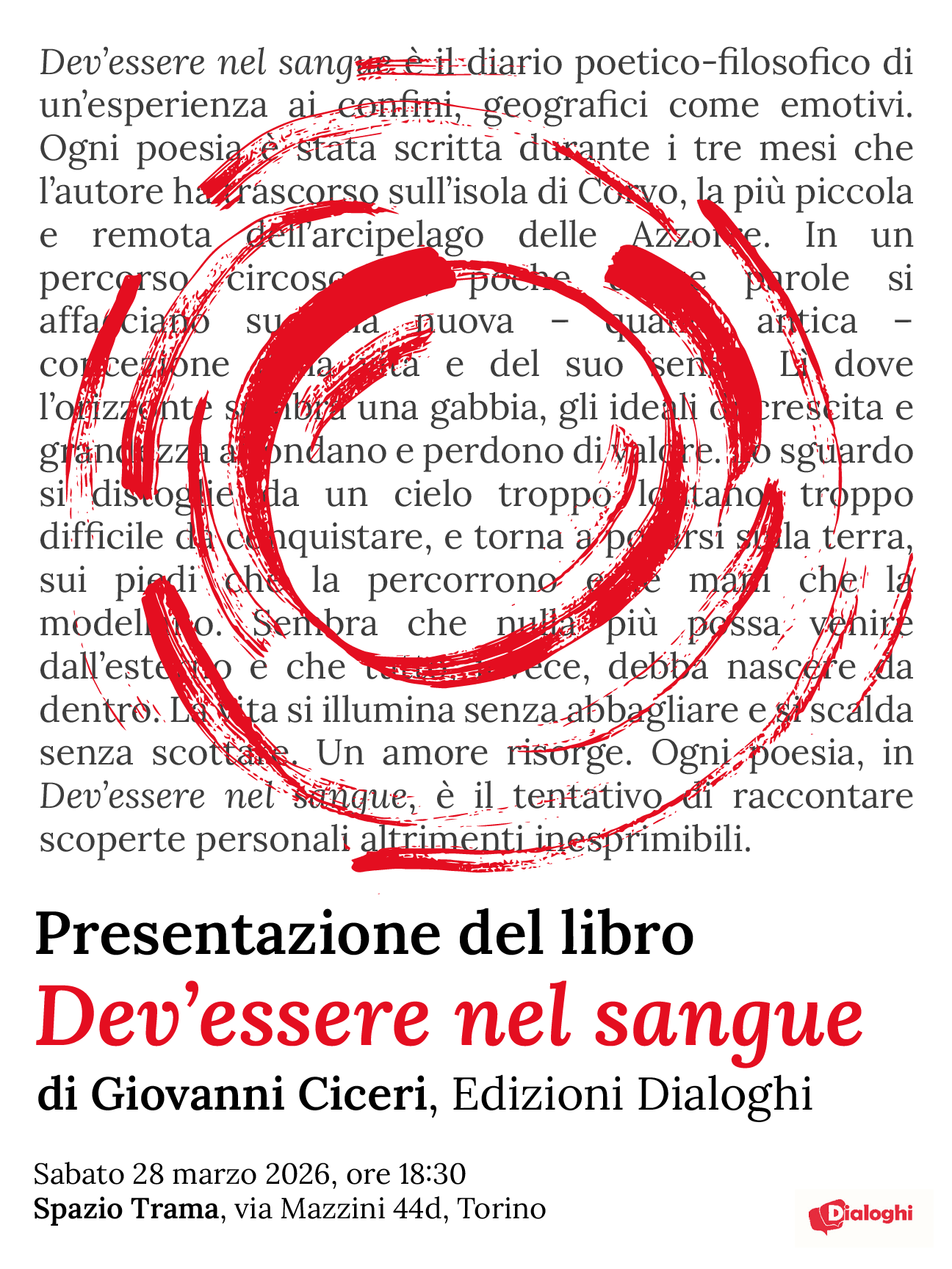 “Dev’essere nel sangue” è il diario poetico-filosofico di un’esperienza ai confini, geografici come emotivi, trascorsa sull’Isola di Corvo, la più piccola e remota delle Azzorre. La presentazione del volume sarà l’occasione di lavorare insieme sulle rivelazioni filosofiche della vita quotidiana e sulla poesia che sanno nascondere.